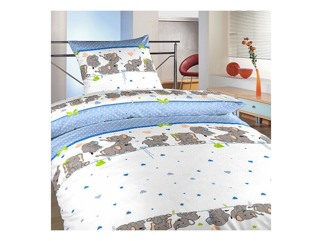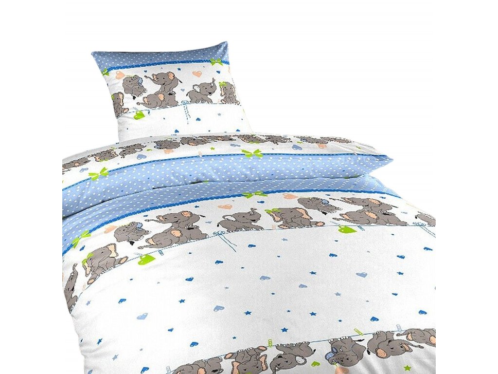 Krepové povlečení do dětské postýlky s motivem sloníků laděné do modré barvy. Rozměr povlečení je 90x130, 45x60 cm.