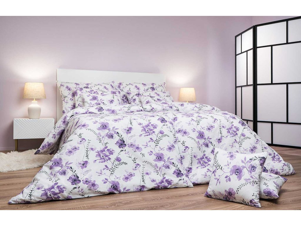 Povlečení krep Kvítí fialové na bílém 220x200, 2x70x90 cm