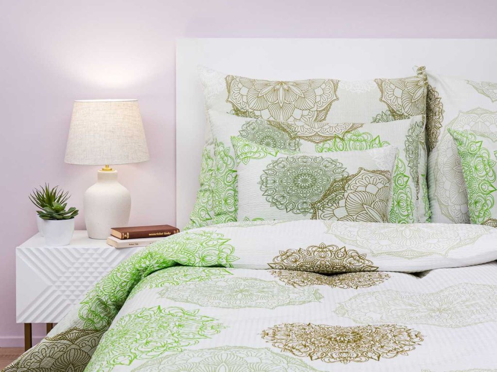 Luxusní ložní prádlo Magic světle zelená s elegantním mandalovým motivem v odstínech zelené a béžové na světlém podkladu přináší do ložnice harmonii a svěžest. Nejlépe vynikne v kombinaci s prostěradlem v barvě olivové, hráškové, bílé, banánové nebo kiwi. Vyrobeno v České republice firmou DADKA VRACOV.