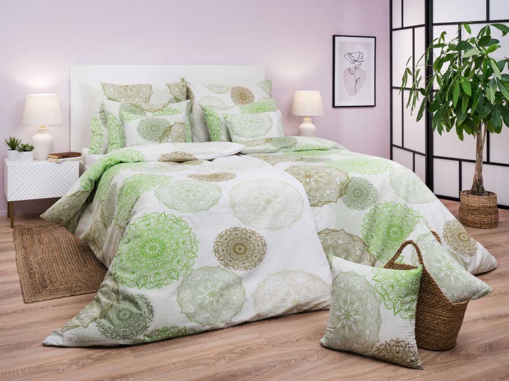 Francouzské povlečení Magic světle zelená 240×220 cm + 2×70×90 cm z 100% bavlny v krepové úpravě. Mandalový motiv, zipové zapínání, snadná údržba bez žehlení. Český výrobek – ideální dárek pro páry.