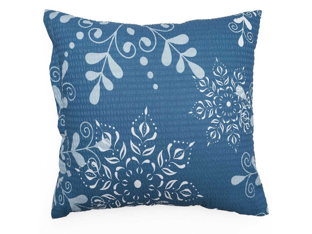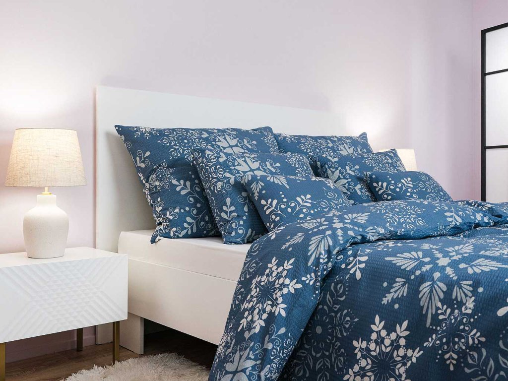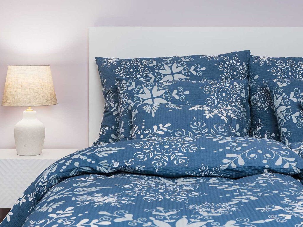 Krepové povlečení Snowflakes šedomodré ve II. jakosti s drobnou estetickou vadou, která neovlivňuje pohodlí ani funkčnost.