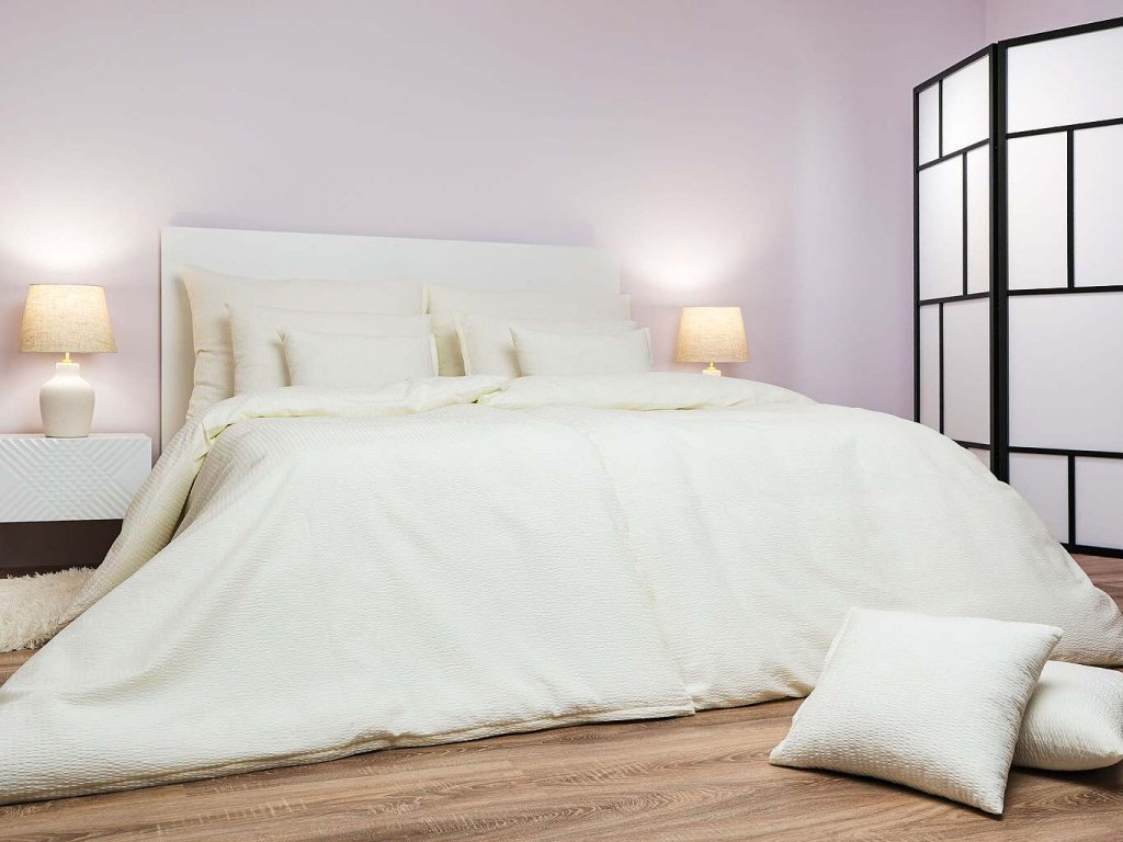 Povlečení je vyrobeno ze 100% kvalitní bavlny v krepové úpravě, která je jemná na dotek, prodyšná a savá. Krepová struktura zajišťuje příjemný komfort při spánku a není nutné žehlení, což šetří čas i energii. Materiál je vhodný pro celoroční používání.