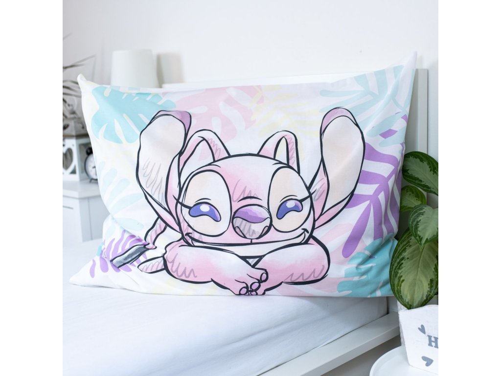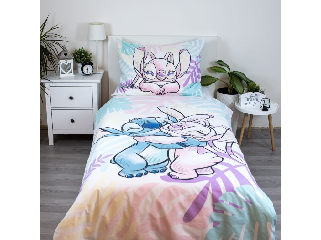 Vstupte do kouzelného světa snů s povlečením Lilo a Stitch Leaves! Tento nádherný design přináší animované postavy na pastelově barevném pozadí s listy, které rozzáří každý dětský pokoj. Na přikrývce je ilustrace Stitche a Angela, kteří se objímají, obklopeni listy v odstínech modré, žluté, růžové a zelené. Na polštářích je Stitch a Angel v podobných pózách, což dodává povlečení pozitivní atmosféru.