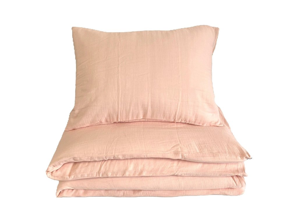 Bavlněné mušelínové povlečení do postýlky v jemné růžové barvě. Povlečení je vhodné kombinovat s pudrovým nebo bílým prostěradlem. Rozměr povlečení je 100x135, 45x60 cm.