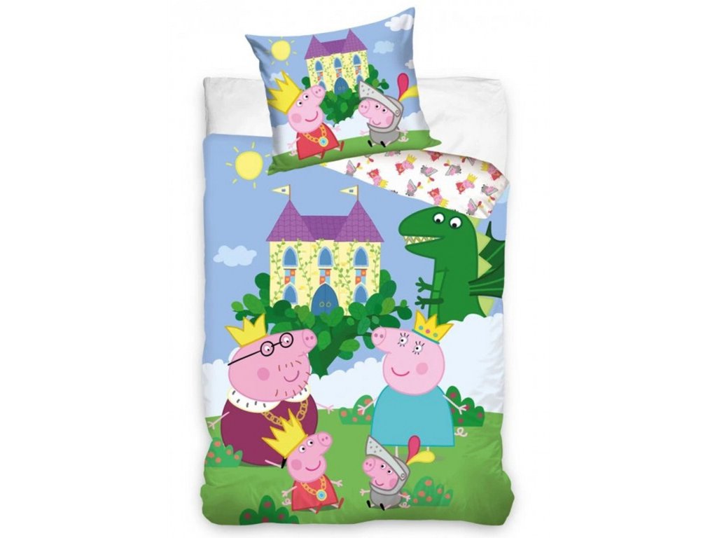 Povlečení s motivem Prasátko Pepina Královská rodinka. Rozměr 140×200 cm + 70×90 cm. Barevný potisk s Prasátkem Pepinou, Georgem a dalšími členy rodiny v královském oblečení na pozadí s hradem a zelení potěší každého malého fanouška.