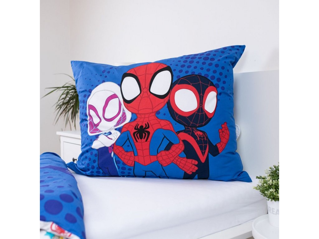Akční dětské povlečení Spidey s motivem Spider-Mana, Spider-Gwen a Milese Moralese na modrém pozadí s pavoučími sítěmi. Vyrobeno ze 100% bavlny, se zapínáním na zip. Ideální pro malé superhrdiny. Rozměr povlečení je 140x200, 70x90 cm.