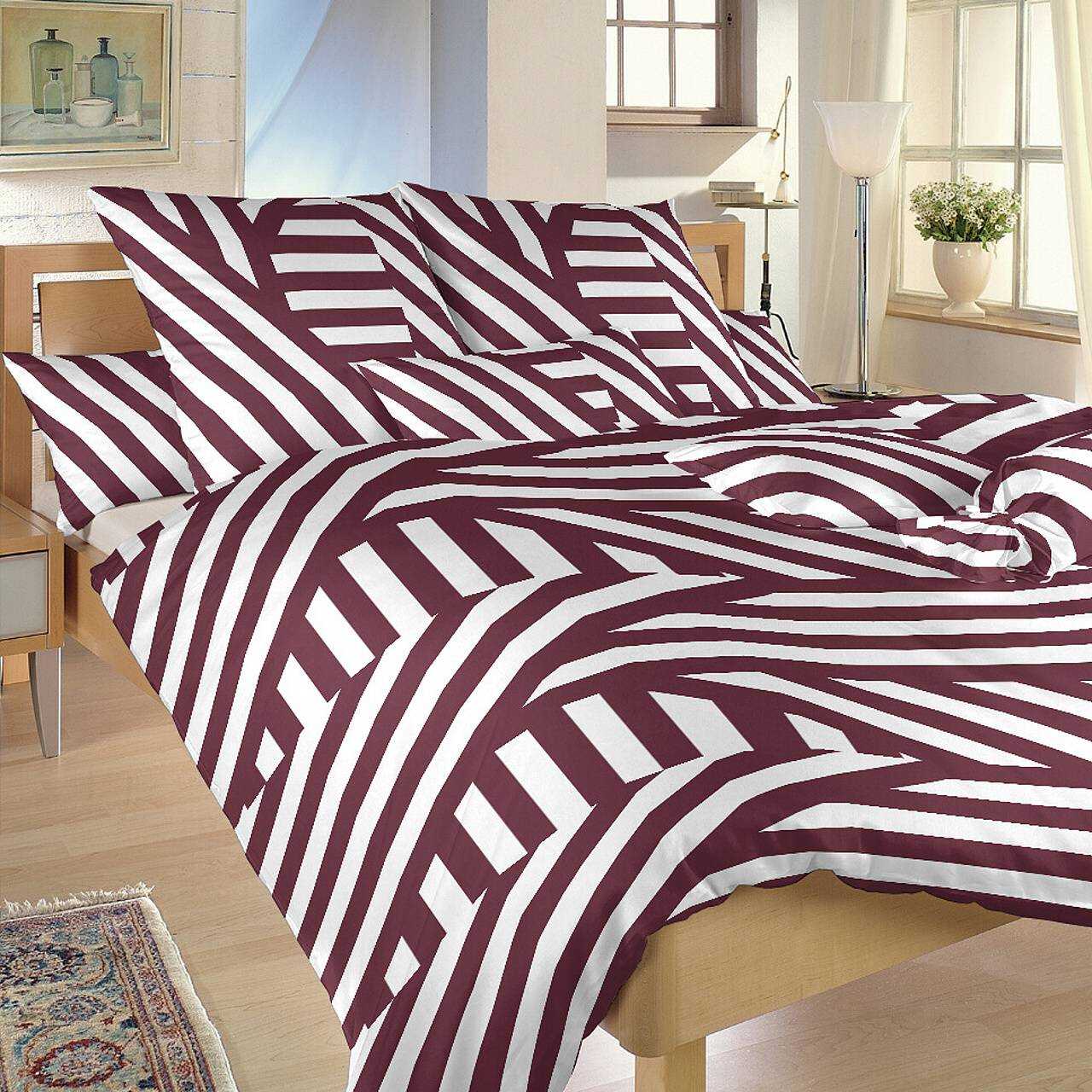 Stylové ložní prádlo Zebra bordó přináší do vaší ložnice energii a originalitu. Vzor širokých diagonálních pruhů v kombinaci bordó (tmavě červené) a bílé barvy působí dynamicky a zároveň elegantně. Tento výrazný design doporučujeme kombinovat s prostěradly v bordó, bílé nebo světle šedé barvě. Vyrobeno v České republice firmou DADKA VRACOV.