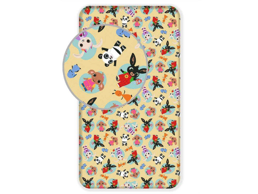 Prostěradlo má světle žlutý podklad a je pokryto opakujícím se vzorem, který zahrnuje různé postavičky z animovaného seriálu Králíček Bing.