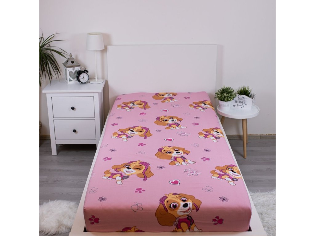 Roztomilé dětské prostěradlo s motivem oblíbené psí hrdinky Skye z animovaného seriálu Tlapková patrola. Růžový podklad zdobí opakující se obrázky Skye v různých pozicích, doplněné o květinky, srdíčka a tlapky. Ideální pro malé fanynky této odvážné pilotky.