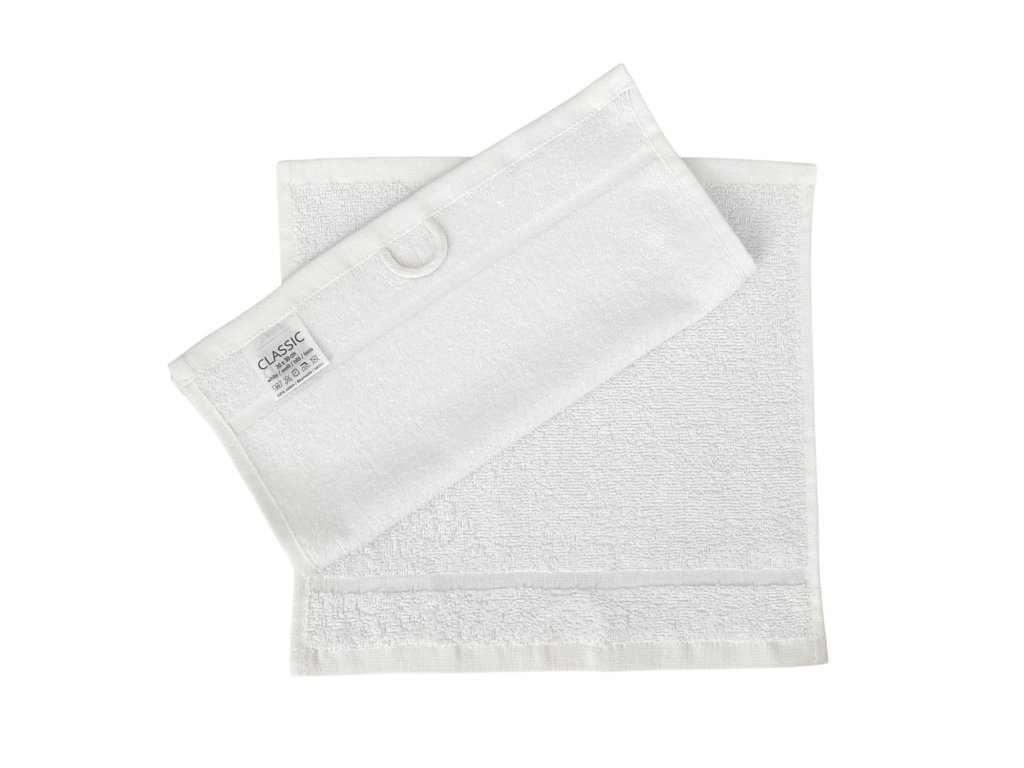 Bílý froté ručník Sofie o rozměru 30×30 cm ze 100% bavlny s gramáží 400 g/m². Kompaktní, hebký a savý ručník s poutkem – ideální pro domácnosti i profesionální provozy.