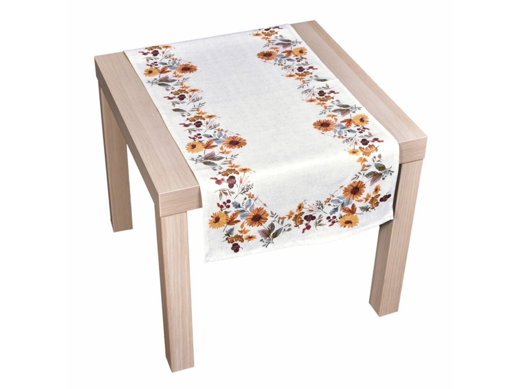 Podzimní ubrus Podzim CYH5953GC o rozměru 40x90 cm. Elegantní motiv listí, slunečnic a bobulí, kvalitní polyester, snadná údržba. Ideální dekorace pro podzimní stůl.