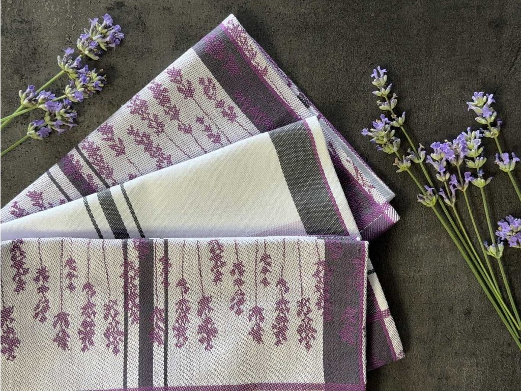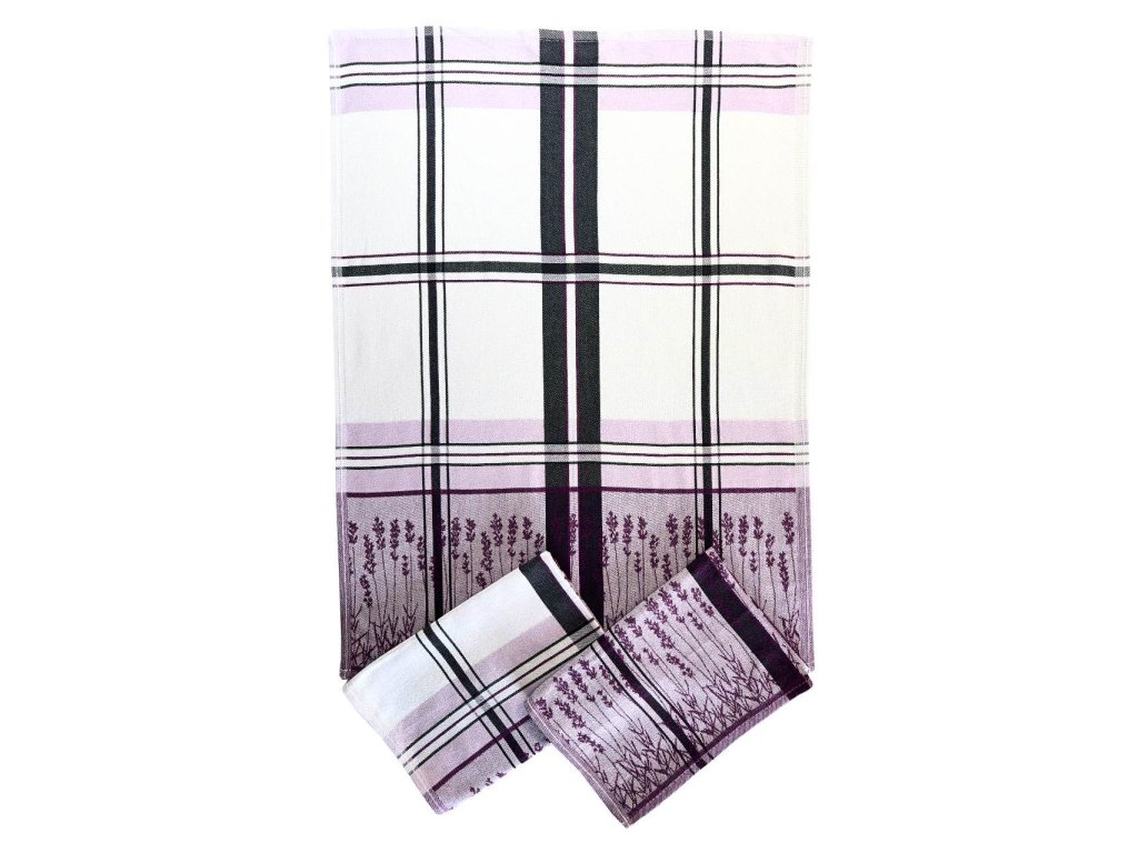 Sada tří bavlněných žakárový utěrek - extra savé. Motivy : kostky kombinované s květy levandule. Rozměr utěrek je 3x 50x70 cm.