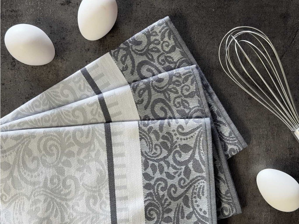 Sada tří bavlněných žakárový utěrek - extra savé se vzorem ornamentů laděné do šedé barvy. Rozměr utěrek je 3x 50x70 cm.