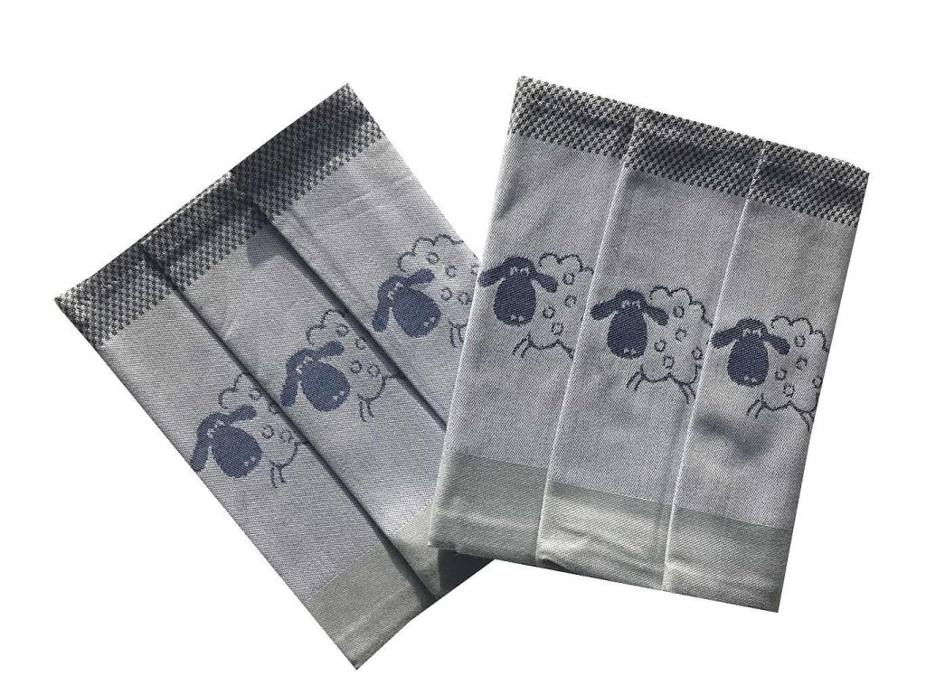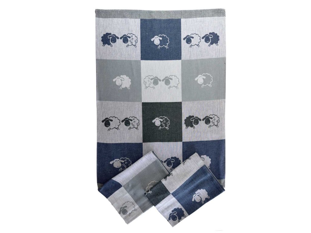 Sada tří bavlněných žakárový utěrek - extra savé. Rozměr utěrek je 3x 50x70 cm. Motiv oveček laděné do modré barvy.