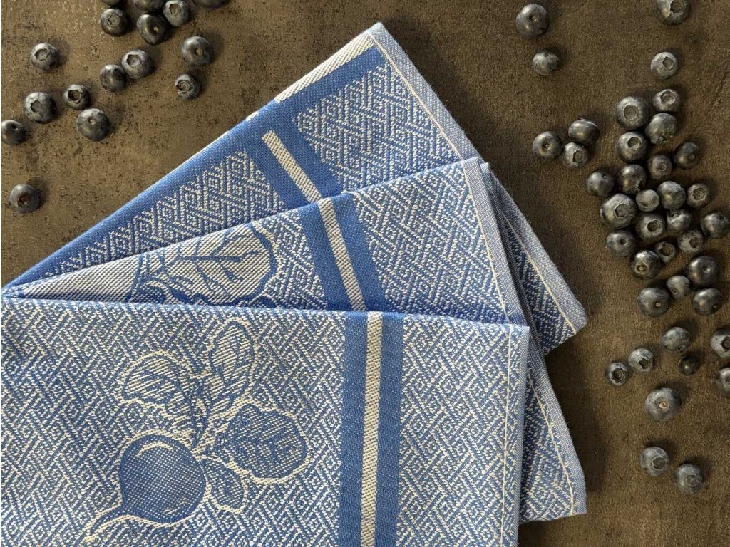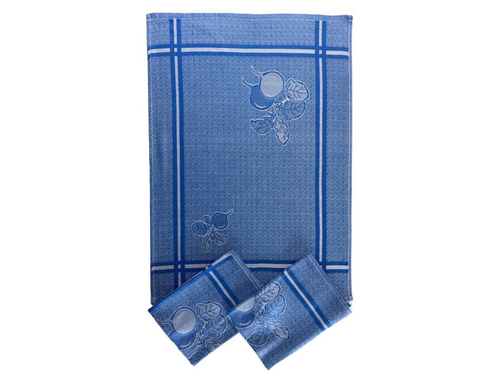Sada tří bavlněných žakárový utěrek - extra savé se vzorem ředkvičky laděné do modré barvy. Rozměr utěrek je 3x 50x70 cm.