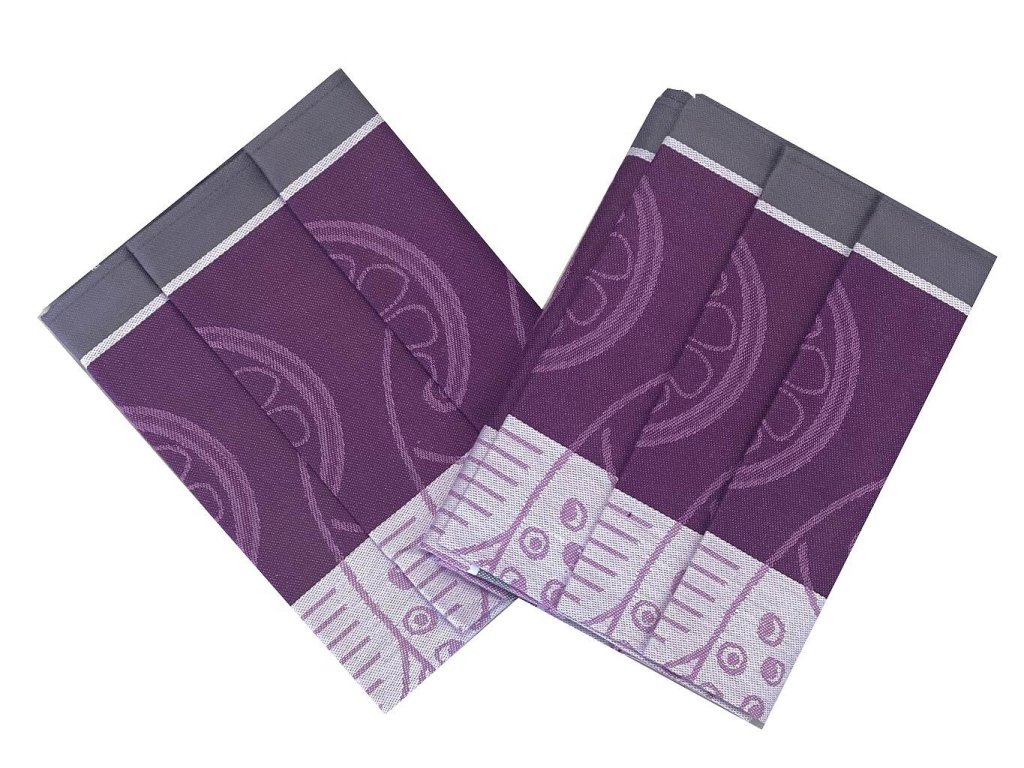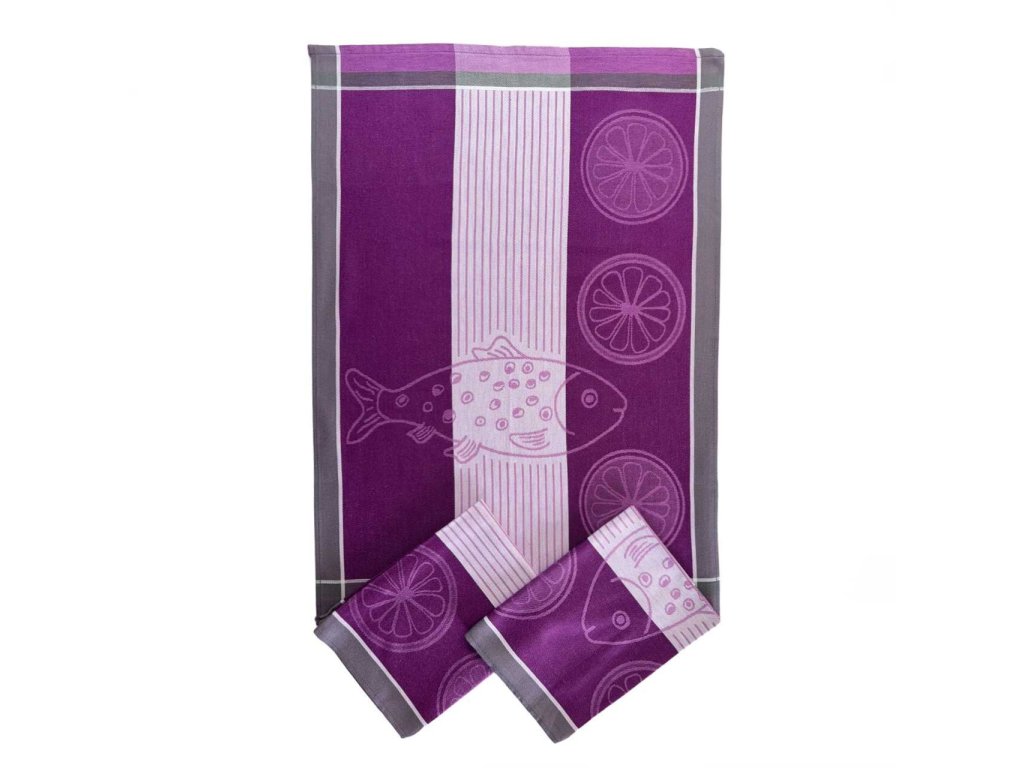 Sada tří bavlněných žakárový utěrek - extra savé. Vzor ryba s citronem fialová.