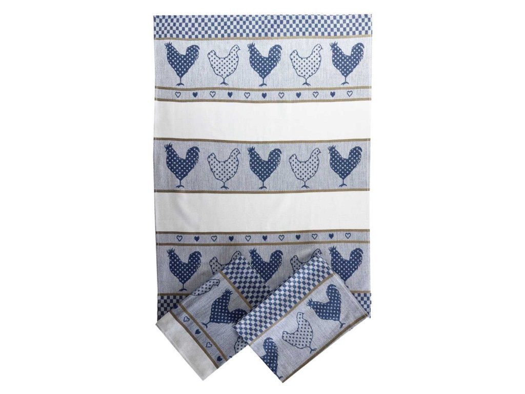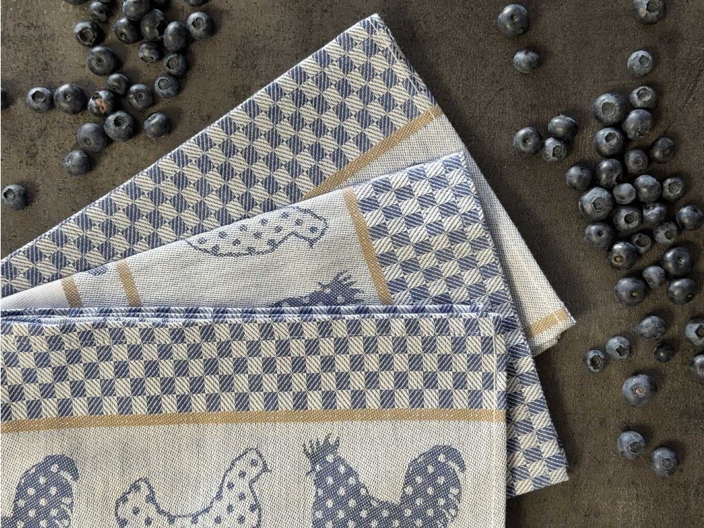 Sada tří bavlněných žakárový utěrek - extra savé. Rozměr utěrek je 3x 50x70 cm. Motiv slepiček v modré barvě.
