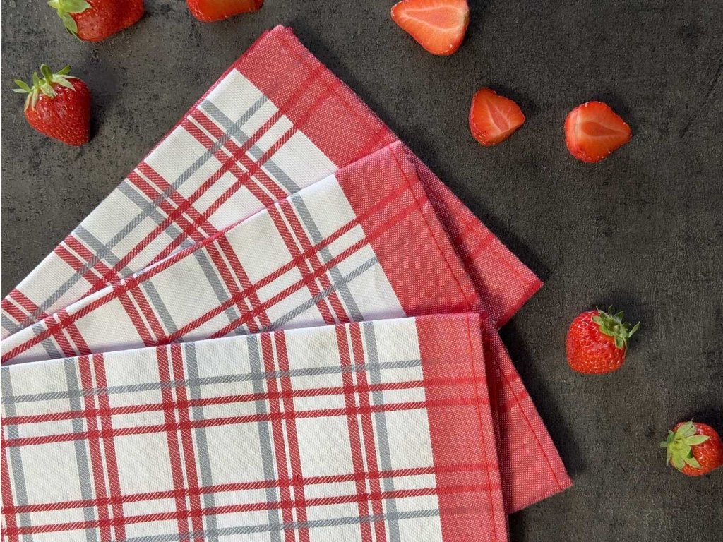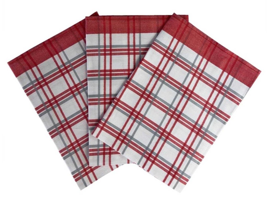 Sada tří bavlněných žakárový utěrek - extra savé. Rozměr utěrek je 3x 50x70 cm. Barva káro červené.