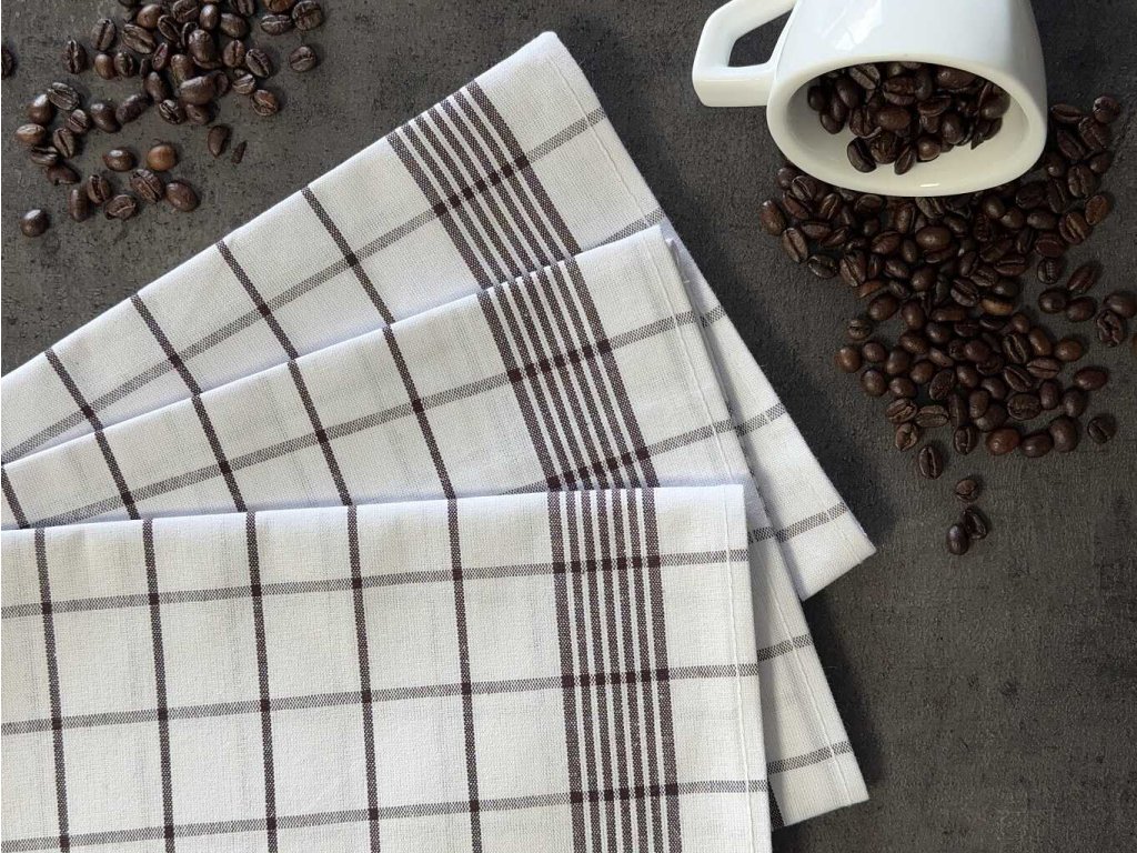 Sada tří bavlněných utěrek s kostkami - kombinace barev bílá a tmavě hnědá.