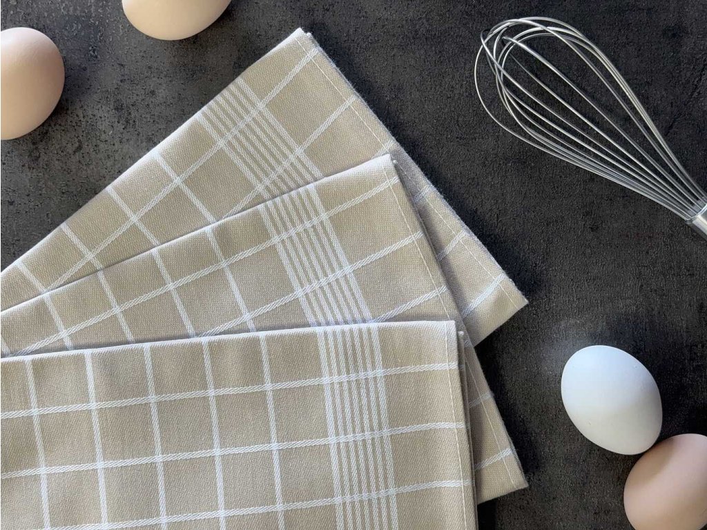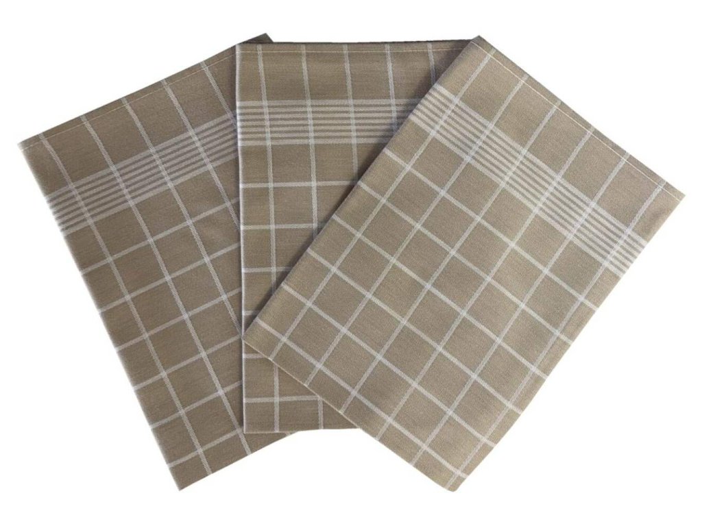 Sada tří bavlněných utěrek s kostkami - kombinace barev béžová a bílá.