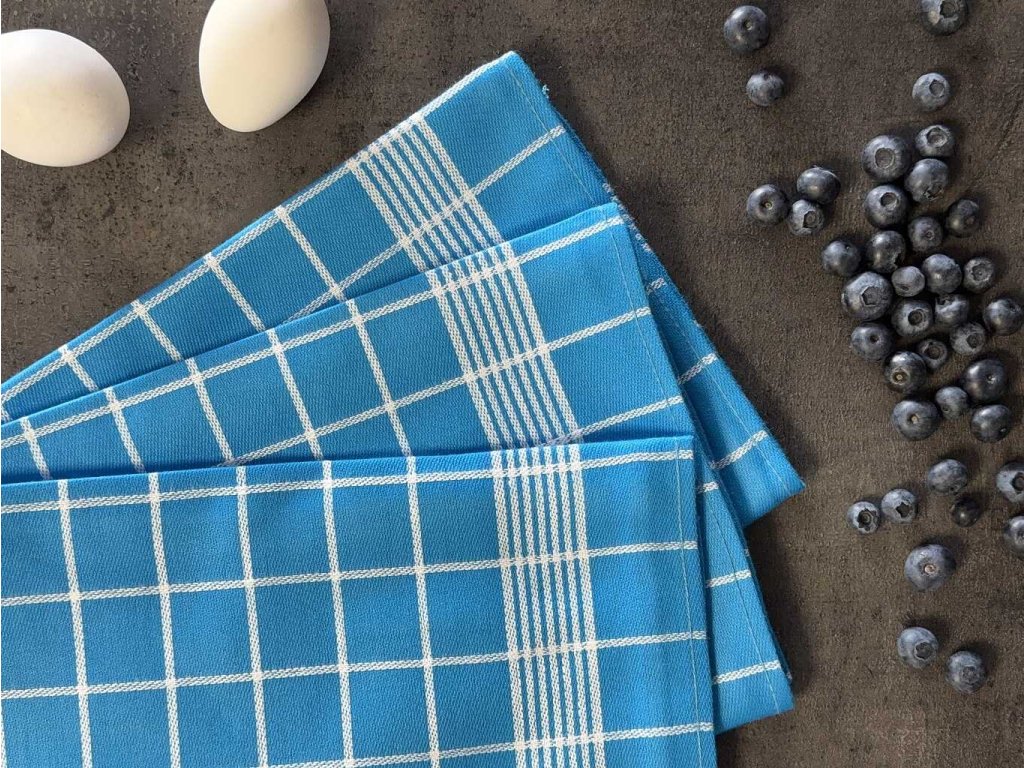 Sada tří bavlněných utěrek s kostkami - kombinace barev tyrkysová a bílá.