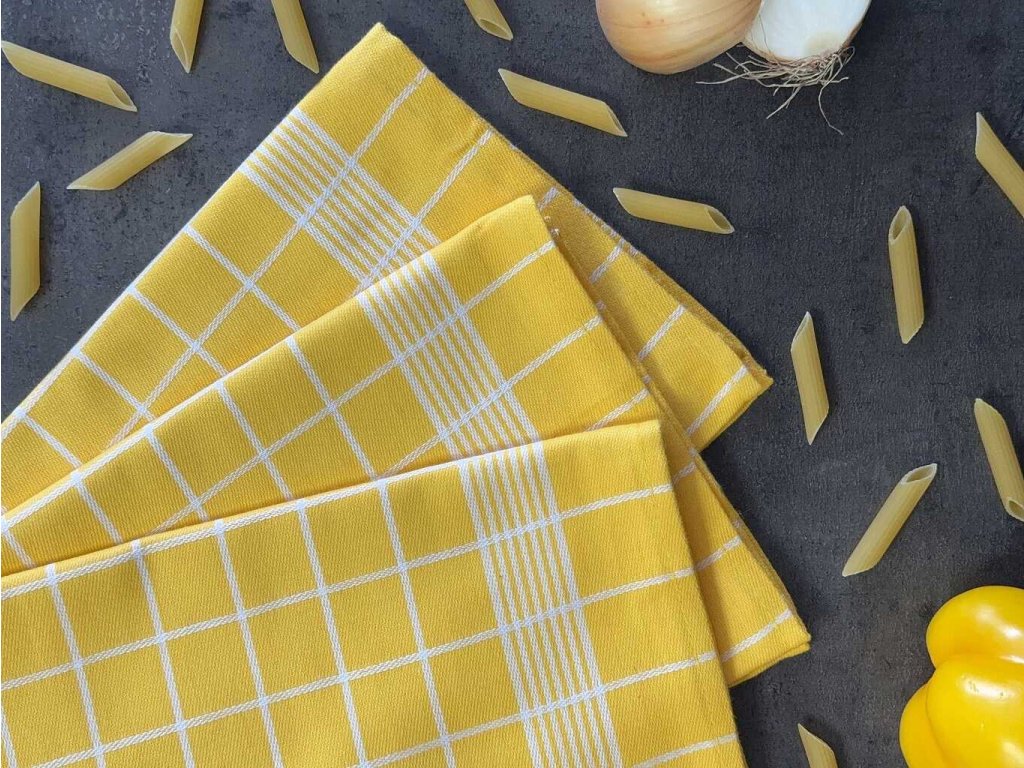 Sada tří bavlněných utěrek s kostkami - kombinace barev bílá a žlutá.