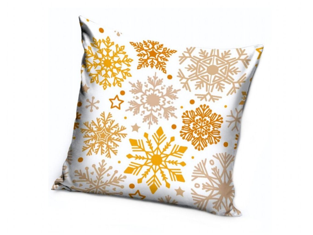 Vánoční povlak na polštářek s motivem zlatých a béžových vloček na bílém podkladu. Hebký mikroplyš Soft Belboa, rozměr 40×40 cm, zapínání na zip. Praní 30 °C, nežehlit nad 110 °C.