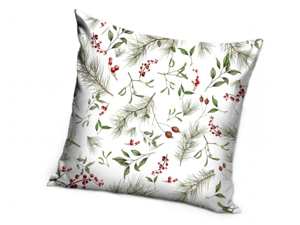 Elegantní vánoční povlak na polštářek v bílé barvě s motivem jehličí, bobulek a lístků. Hebký mikroplyš Soft Belboa, rozměr 40×40 cm, zapínání na zip. Skvělý doplněk pro sváteční dekoraci.