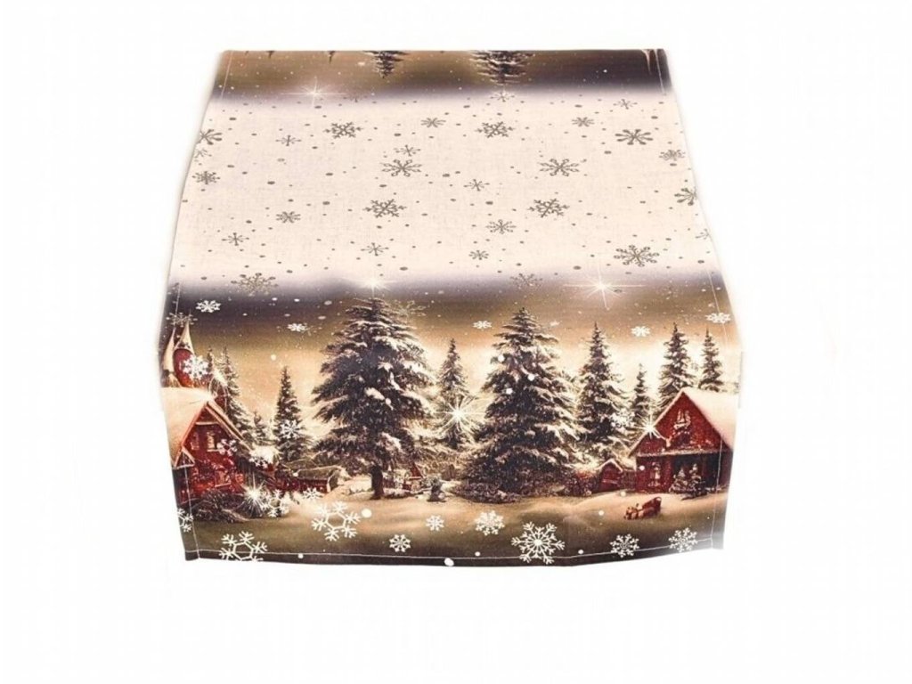 Vánoční ubrus s motivem zasněžené krajiny, rozměr 40x140 cm. Vyroben ze 100% polyesteru, snadno pratelný na 40 °C. Stylový doplněk pro sváteční stolování a zimní dekoraci vašeho domova.