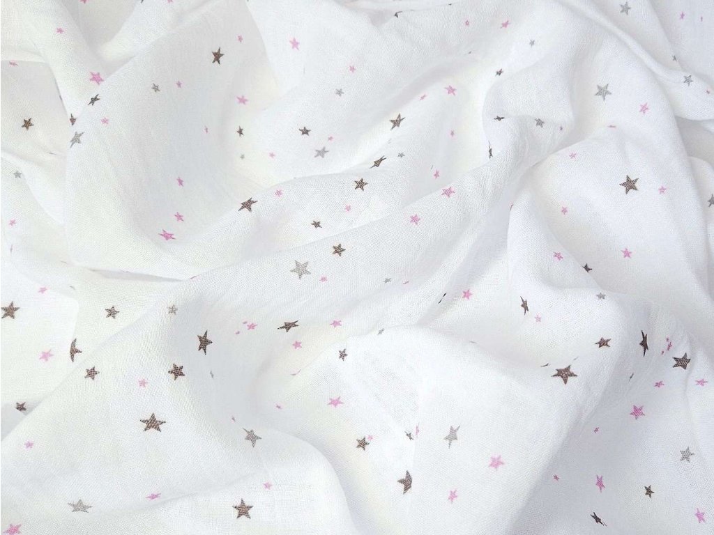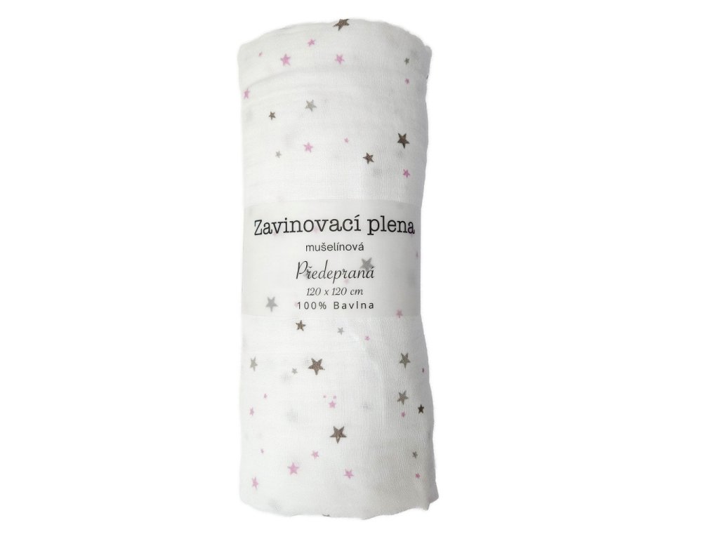 Látková zavinovací plena je velmi jemná, měkká a prodyšná se vzorem fialových a šedých hvězdiček. Rozměr pleny je 120x120 cm, balení obsahuje 1 ks.